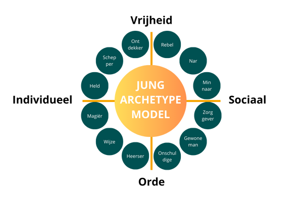 Ik gebruik ook graag het archetypenmodel van Jung om een merkpersoonlijkheid te omschrijven. Deze benadering helpt merken om een karakter te ontwikkelen alsof het een persoon is, waardoor een merk consistent en herkenbaar wordt. Gebaseerd op vier verschillende kwadranten zijn er twaalf persoonlijkheden, van de geliefde tot de nar tot de held. Elke persoonlijkheid heeft zijn eigen identiteit en kenmerken. Het vastleggen van een merkpersoonlijkheid is enorm handig, vooral in organisaties waar veel verschillende mensen werken aan de merkuitingen. Als iedereen op dezelfde manier de merkuitingen vormgeeft, maak je van je merk een herkenbare, consistente en krachtige persoonlijkheid.